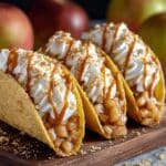 Apple Pie Tacos are a fun and delicious twist on a classic dessert. Crisp cinnamon-coated taco shells hold warm, sweet apple filling topped with creamy whipped cream and caramel sauce. They’re easy to make and perfect for impressing guests or indulging a cozy night in.
