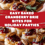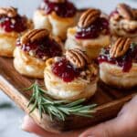 These Baked Cranberry Brie Bites are a perfect festive appetizer combining flaky puff pastry, creamy brie cheese, and tangy cranberry sauce. Topped with optional candied pecans and fresh rosemary sprigs, they offer a delightful mix of textures and flavors that are easy to prepare and sure to impress your guests.