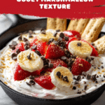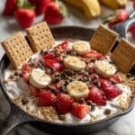 This Banana Split Smores Dip is a delightful fusion of classic American treats, combining the flavors of a banana split and s’mores into one warm, gooey dessert. Prepared in a cast iron skillet, this dessert layers crushed graham crackers, semi-sweet chocolate chips, mini marshmallows, sliced bananas, strawberries, and chopped pecans, all broiled to golden perfection for a fun and shareable treat that’s perfect for indoor ovens or campfire cooking.