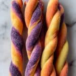The image shows four twisted dough sticks arranged side by side, alternating between two color patterns. Two sticks have a purple and orange marbled look with a rough texture, and the other two sticks are orange with a yellow gradient, also showing a slightly rough surface. They are placed on a white marbled surface, highlighting the bright colors of the dough. The twisting gives each stick a spiral appearance with smooth curves and a mix of vibrant colors swirling through each piece. photo taken with an iphone --ar 4:5 --v 7