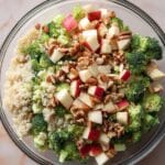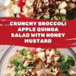 This healthy Broccoli Apple Quinoa Salad is a nutritious, gluten-free, and vegetarian grain bowl combining fluffy quinoa, crisp broccoli, juicy honeycrisp apples, and crunchy toasted walnuts and almonds. Tossed in a light honey mustard dressing with crumbled feta cheese and a touch of dried cranberries for sweetness, this salad offers a perfect balance of flavors and textures, making it a refreshing and wholesome meal or side dish.