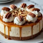 - Assemble and Serve: Pour the browned butter caramel sauce over the chilled cheesecake. Top with whipped cream and garnish with pecan halves. Slice and serve to enjoy this decadent dessert.