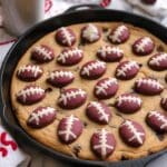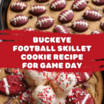 This Buckeye Football Skillet Cookie is a fun and indulgent treat perfect for game day or any casual gathering. Combining rich peanut butter cookie dough, chopped peanut butter cups, and festive football-shaped sugar cookies on top, it’s a crowd-pleaser that’s easy to make and serve warm with ice cream.