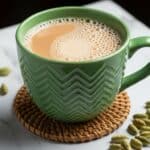 A green ceramic cup with a textured zigzag pattern is filled with light brown frothy tea, resting on a woven bamboo coaster. The tea surface has small bubbles with a smooth cream-colored spot near the center. Around the cup and coaster, green cardamom pods are scattered on a dark surface. The background is blurred dark, contrasting with the cup's color and details, all placed on a white marbled texture. photo taken with an iphone --ar 4:5 --v 7