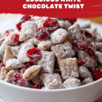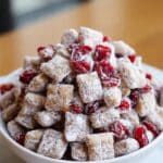 Keywords: Cherry Cheesecake Puppy Chow, snack mix, white chocolate, dried cherries, Chex cereal, no-bake dessert, party snack, sweet treat