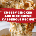 This Chicken and Rice Queso Casserole is a creamy, cheesy, and hearty meal featuring tender, seasoned chicken combined with cheesy queso dip, instant rice, and flavorful spices. Cooked chicken is layered over a rich mixture of queso, heavy cream, green chiles, and rice, then topped with melted Mexican cheese for a comforting casserole perfect for weeknight dinners.