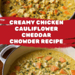 This Chicken Cauliflower Cheddar Chowder is a healthy and hearty soup that’s creamy and rich without using any cream. Packed with fresh vegetables including cauliflower, potatoes, carrots, and celery, combined with lean chicken or turkey, it offers a satisfying and nutritious meal. The soup is thickened with a beurre manié and finished with sharp cheddar cheese for a perfect comfort food experience.