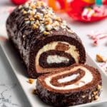 This decadent Chocolate Bourbon Pecan Swiss Roll features a rich cocoa sponge cake brushed with bourbon, filled with a smooth cream cheese filling, and topped with luscious chocolate ganache and bourbon caramel sauce. Finished with a sprinkle of praline pecans and chocolate shavings, it’s a show-stopping dessert perfect for special occasions.