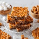 - Serve: Cut the treats into squares and enjoy your delicious Chocolate Churro Rice Krispie Treats with Caramel Drizzle!