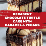 A rich and decadent Chocolate Turtle Cake featuring moist chocolate layers studded with semi-sweet chocolate chips, layered and topped with luscious caramel sauce and crunchy chopped pecans. Perfectly balanced between chocolate and caramel flavors with a delightful crunchy texture, this cake is an indulgent treat for any occasion.