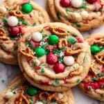 Sweet and salty Christmas Kitchen Sink Cookies packed with pretzel and potato chip pieces, red and green M&M’s, white chocolate chips, and festive sprinkles. These chewy, colorful cookies combine a variety of flavors and textures, perfect for holiday celebrations or baking with kids. They require no chill time and bake quickly, making them an easy and fun festive treat.