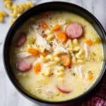 A close-up of a black bowl filled with creamy soup showing three main layers: the base layer is a light yellow creamy broth, the middle layer has chunks of orange carrots and small elbow pasta pieces scattered throughout, and the top layer shows slices of pink sausage and shredded white chicken meat. A few elbow pasta pieces are positioned around the bowl on a white marbled surface. A red and white checkered cloth can be seen at the lower right corner of the image. photo taken with an iphone --ar 4:5 --v 7