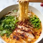Creamy Marry Me Chicken Ramen combines tender, flour-coated chicken breasts seared to golden perfection with a rich, savory broth featuring sun-dried tomatoes, smoked paprika, and parmesan cheese. Paired with tender ramen noodles and topped with fresh cilantro, bean sprouts, edamame, scallions, and a drizzle of chili oil, this dish offers a delightful fusion of comforting creaminess and bold flavors.