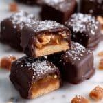 These Date Caramels are a rich, homemade candy made from butter, sugar, corn syrup, and cream, slowly cooked to a deep amber caramel, then infused with vanilla and a hint of salt. Optional nuts add a delightful crunch, while sea salt flakes enhance the flavor. Perfectly soft, chewy, and buttery, these caramels make an excellent sweet treat or a luxurious topping for your favorite desserts.