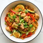 A bowl filled with wide, flat orange noodles mixed with chunks of cooked chicken, thin slices of green zucchini, red and green bell pepper strips, and chopped green onions scattered on top. The dish is garnished with small green leafy herbs and a sprinkle of red chili flakes, creating a colorful, fresh look. The bowl is white with a dark rim and is placed on a white marbled surface. Photo taken with an iphone --ar 4:5 --v 7