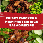 This Easy High Protein Crispy Rice Salad combines tender, golden chicken thighs with a crunchy, flavorful crispy rice topping, fresh vegetables like cucumber and lettuce, and a zesty cilantro lime dressing. The dish is a harmonious blend of textures and vibrant flavors, perfect for a satisfying and nutritious meal that’s quick to prepare.
