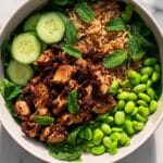This Easy High Protein Crispy Rice Salad combines tender, golden chicken thighs with a crunchy, flavorful crispy rice topping, fresh vegetables like cucumber and lettuce, and a zesty cilantro lime dressing. The dish is a harmonious blend of textures and vibrant flavors, perfect for a satisfying and nutritious meal that’s quick to prepare.
