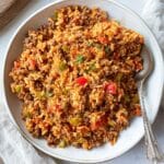 This Easy Unstuffed Pepper Skillet is a quick and flavorful one-pot recipe that delivers all the deliciousness of stuffed bell peppers without the hassle of stuffing. Ground beef, aromatic spices, bell peppers, rice, and fire-roasted tomatoes come together in a hearty skillet meal that’s perfect for busy weeknights. Topped with melted cheddar cheese, it’s a crowd-pleaser that’s ready in under 40 minutes.