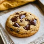 A single thick chocolate chip cookie sits on a piece of white parchment paper that covers a metal baking tray. The cookie is golden brown with a soft, slightly crinkled texture and large, shiny dark brown chocolate chunks scattered across the top. The background includes a hint of a folded golden cloth in the upper part of the image, all placed on a white marbled surface. photo taken with an iphone --ar 4:5 --v 7