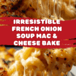 Keywords: French onion soup, mac and cheese, baked pasta, caramelized onions, Gruyère, comfort food, cheesy casserole