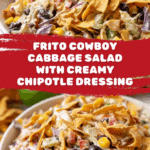 Frito Cowboy Cabbage is a bold and flavorful coleslaw variation packed with crunchy coleslaw mix, black beans, corn, fresh jalapeño and red bell peppers, green onions, and fresh cilantro. Tossed in a creamy chipotle dressing made with sour cream, mayonnaise, lime juice, and chipotle sauce, it’s topped with crunchy Chili Cheese Fritos for an addictive texture contrast. Perfect as a side dish for BBQs, potlucks, or taco night, this no-cook salad combines smoky, spicy, and tangy tastes with satisfying crunch.