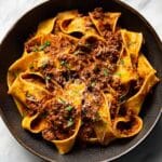 The image shows a dark bowl filled with wide, flat pasta ribbons mixed with a rich brown meat sauce. The pasta is a warm golden-orange color with a smooth, slightly curled texture, layered evenly throughout the dish. The meat sauce is chunky and thick, covering much of the pasta and adding a coarse texture. Small green herb pieces are sprinkled on top, adding a fresh contrast to the warm tones of the pasta and sauce. The white marbled surface underneath softly reflects light, highlighting the dish’s colors and textures. photo taken with an iphone --ar 4:5 --v 7