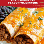 Keywords: ground beef enchiladas, Mexican casserole, baked enchiladas, taco seasoned beef, easy dinner recipe