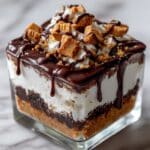 5. Chill and Serve: Refrigerate the dessert for at least 4 hours to allow the layers to set firmly. Once chilled, slice the dessert into squares and top each serving with chopped peanuts, mini Reese’s pieces, and chocolate curls as desired for added texture and decoration.