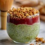 - Assemble and Serve: If desired, spoon a tablespoon of strawberry jam into serving dishes. Layer the chilled chia pudding on top, then finish by sprinkling the crumble generously over the pudding. Serve chilled and enjoy the refreshing matcha cheesecake flavors with a delightful crunchy contrast.