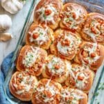 - Prep rolls: Arrange the King’s Hawaiian rolls snugly in a 9×13-inch baking pan. Using a serrated knife, carefully cut out a hole in the center of each roll to create space for the fillings. Brush the tops of the rolls and the edges of the holes evenly with the prepared garlic butter mixture.