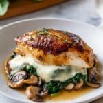 This Mushroom Stuffed Chicken Breast recipe features tender boneless chicken breasts filled with a savory mixture of sautéed mushrooms, garlic, thyme, and fresh spinach, topped with melted mozzarella cheese. The chicken is first seared to achieve a golden crust and then baked to juicy perfection. It’s an elegant yet simple dish perfect for a delicious home-cooked meal.