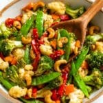 This Paleo Cashew Chicken recipe is a healthy, homemade spin on the classic Chinese takeout dish, featuring tender chicken, crunchy cashews, broccoli, snap peas, bell peppers, and a savory-sweet sauce. Ready in 30 minutes or less, this dish is Whole30, Keto, gluten-free, and soy-free, making it perfect for those seeking a nutritious and flavorful meal without compromising dietary preferences.