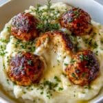 Parmesan Cloud Chicken Bombs are tender, flavorful ground chicken meatballs baked to golden perfection and smothered in a rich, creamy Parmesan and mozzarella sauce. These bite-sized delights, infused with garlic, herbs, and spices, are served atop velvety mashed potatoes or cauliflower purée, making for a comforting and elegant meal.