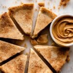 A round dessert cut into eight equal triangle slices arranged in a circle on a white marbled surface, each slice having a golden-brown top dusted with coarse sugar crystals and showing a slightly crumbly texture at the edges, with some crumbs scattered around; next to the circle of slices is a white dish filled with smooth, creamy peanut butter in a rich caramel color, with visible swirls from stirring. photo taken with an iphone --ar 4:5 --v 7