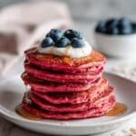 Delightfully colorful and nutritious Pink Beet Pancakes made with rolled oats, fresh beets, and natural sweeteners. These fluffy pancakes are naturally gluten-free when using certified oats, packed with fiber and protein, and perfect for a healthy breakfast or brunch.