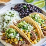 Keywords: Pork carnitas tacos, street tacos, Mexican tacos, corn tortillas, guacamole, queso fresco, quick pork recipe