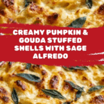 Discover the comforting flavors of fall with these Pumpkin & Gouda Stuffed Shells topped with a rich Brown Butter & Sage Alfredo Sauce. This dish combines creamy pumpkin and cheeses stuffed into tender pasta shells, baked to golden perfection. It’s perfect for a cozy family dinner or special occasion.
