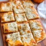 A wooden board holds 16 square pieces of a thin pizza sliced evenly. The pizza has one main thin crust layer with a light golden-brown edge and soft texture. On top, there is an orange melted cheese layer spread close to the edges. Above that, a more melted white cheese layer with a slightly bubbly, creamy texture covers each piece partially. Scattered finely on top are greenish dried herbs adding a speckled look. The background shows a soft white marbled texture with an orange pumpkin partially visible. The photo taken with an iphone --ar 4:5 --v 7