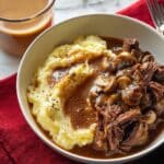 This image shows a white bowl filled with two main layers: creamy mashed potatoes on one side, which are smooth and pale with a drizzle of brown gravy on top, and tender shredded beef in brown gravy on the other side, the meat looks juicy and soft with visible mushroom pieces mixed in. The bowl sits on a red cloth napkin, all placed on a white marbled surface. In the background, there is a glass container with more brown gravy. Photo taken with an iphone --ar 4:5 --v 7