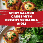 Keywords: salmon cakes, spicy salmon patties, sriracha aioli, seafood recipe, quick dinner, salmon fishcakes, easy salmon recipe, pan-fried salmon cakes