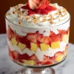 A delightful and visually stunning Strawberry Cream Trifle featuring layers of tender pound cake, fresh and frozen strawberries, creamy strawberry yogurt pudding mixture, toasted almonds, and whipped topping. Perfect for spring and summer gatherings, this no-bake dessert combines fresh fruit with a luscious, creamy texture for an irresistible treat.