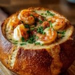 A deliciously creamy and cheesy stuffed seafood bread bowl featuring tender shrimp and lump crab meat combined with a flavorful blend of cheeses and seasonings, baked inside a crispy sourdough shell. Perfect as a hearty appetizer or a comforting main dish.