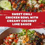 This Sweet Chili Chicken Bowl with Coconut Lime Drizzle is a flavorful and vibrant meal that’s easy to prepare on a weeknight. Tender chicken thighs marinated in sweet chili sauce and soy are served over fluffy jasmine rice, topped with fresh tomatoes and a creamy coconut lime sauce for a refreshing finish.
