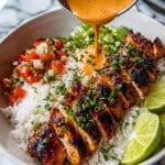 This Sweet Chili Chicken Bowl with Coconut Lime Drizzle is a flavorful and vibrant meal that’s easy to prepare on a weeknight. Tender chicken thighs marinated in sweet chili sauce and soy are served over fluffy jasmine rice, topped with fresh tomatoes and a creamy coconut lime sauce for a refreshing finish.