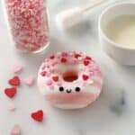 - Alternative decoration: For a different approach, drizzle the melted white candy coating over the donuts and immediately sprinkle the Valentine’s sprinkles on top to adhere while the coating is still wet.
