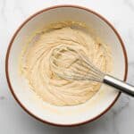 A white bowl with a brown rim holds a thick, creamy batter with small lumps, beige in color, filling most of the bowl. Partly dipped in the batter is a metal whisk with black silicone-coated wires, resting inside the bowl on the right side. The bowl sits on a white marbled textured surface. photo taken with an iphone --ar 4:5 --v 7